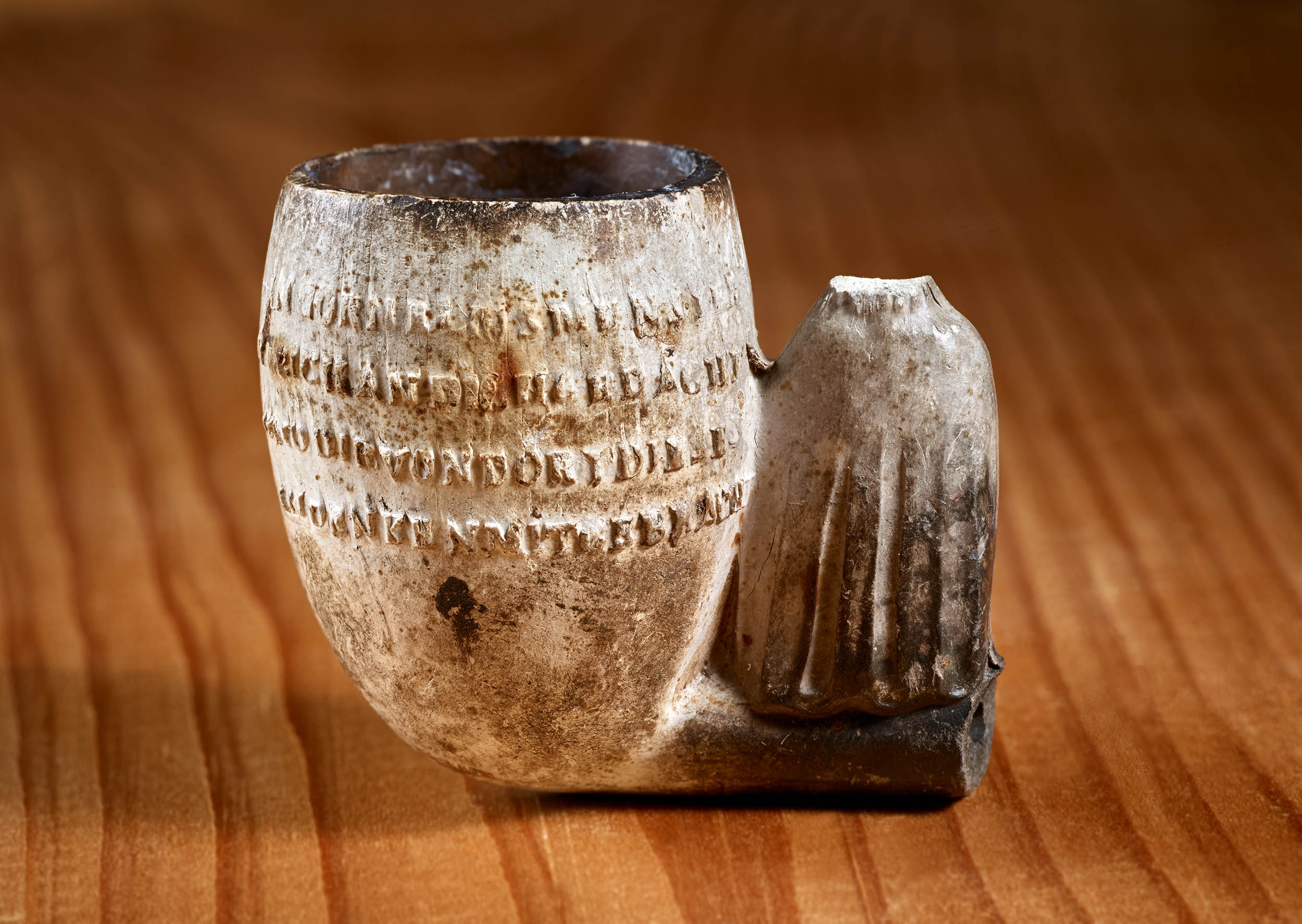 Rückseite des Pfeifenkopfes mit Inschrift. Foto: Jürgen Vogel/LVR-Landesmuseum Bonn