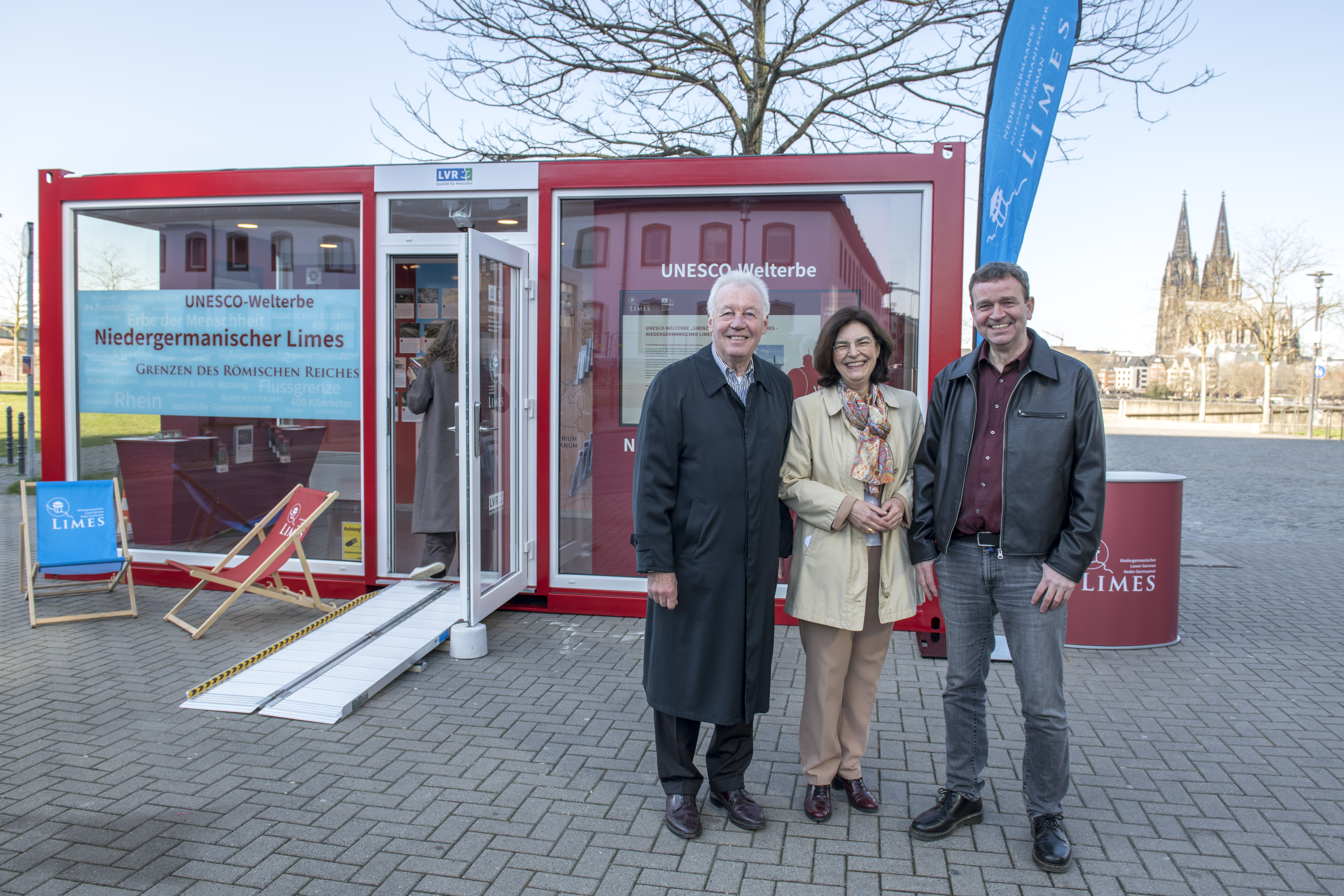 Prof. Dr. Jürgen Wilhelm, Dr. Corinna Franz und Dr. Erich Claßen, eröffneten das Informationszentrum zum UNESCO-Welterbe Niedergermanischer Limes am Deutzer Rheinufer.